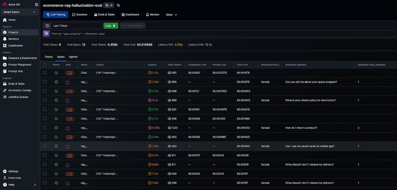 When you run this, you'll see three patterns: For questions that match the FAQ database well, the first attempt usually passes evaluation immediately. The model retrieves relevant context and generates a grounded answer without needing a retry. When the model adds information not in the retrieved context, the evaluator catches it. The retry with the anti-hallucination prompt produces a more conservative response that sticks to what's actually in the context. For completely irrelevant questions (like asking about a space program in an e-commerce FAQ system), the model learns to say "I don't have information about that" instead of fabricating an answer.