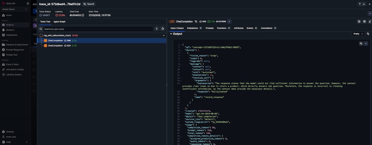 The evaluation explanations are useful for debugging. You can see exactly why a response was flagged and how the model's output changed after the corrective prompt. The following output shows that RAG hallucinated for question 3. When we retried after fixing the promot, the response did not contain any hallucination.