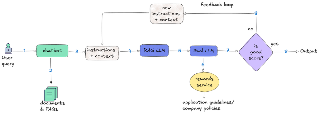 - Feedback: Second, based on the evaluation, we generate specific corrective guidance. If the model invented facts, we craft a stricter prompt emphasizing grounding in the context. If it was too verbose, we add constraints and direct it to be concise. If it missed key information, we explicitly direct it to address those gaps. The feedback is targeted with precise instructions on what to fix.