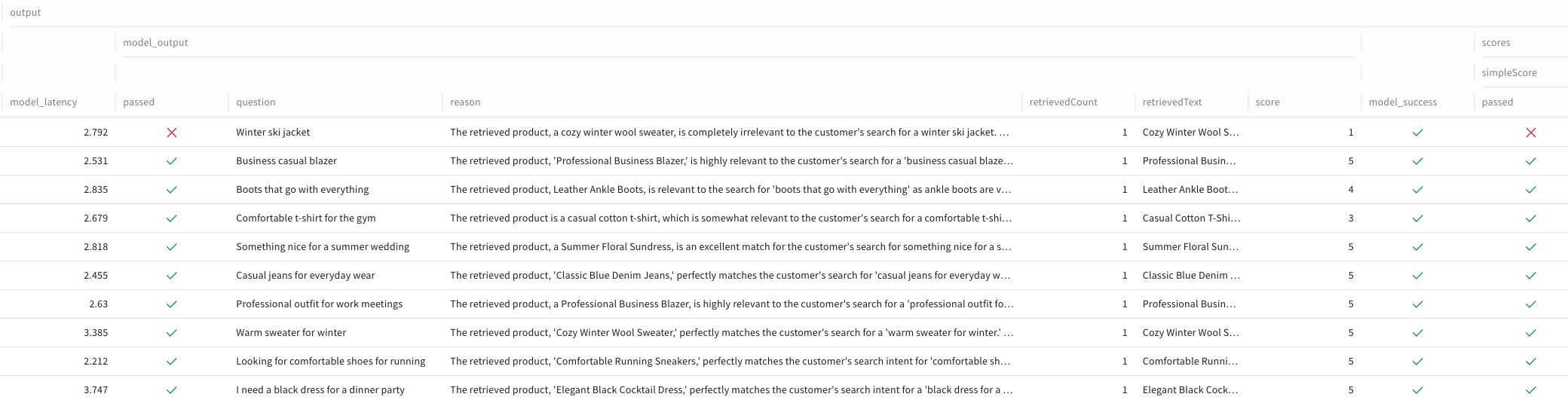 The screenshot below shows the LLM judge evaluating each search result against our retail search criteria. With a threshold score of 3, any evaluation below this mark registers as a failure. Notice the edge case where the inventory lacks a ski jacket and returns a wool sweater instead—the judge correctly identifies this mismatch and fails the test. Each evaluation includes the judge's reasoning, demonstrating how the prompt configuration drives consistent decision-making across different scenarios.