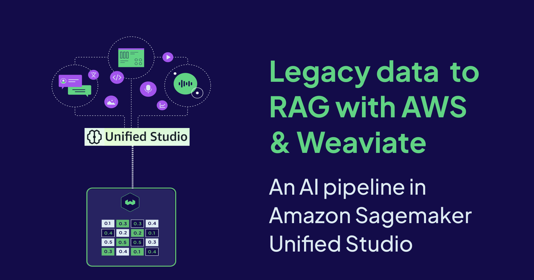 Weaviate and SageMaker Unified Studio together empower teams to build real-time generative AI applications powered by vector search and RAG. Whether you're a data scientist experimenting with embeddings, an ML engineer optimizing pipelines, or a developer building customer-facing applications, the integration lets you deploy your embedding models (custom or LLM-based) through SageMaker and seamlessly vectorize data in Weaviate.