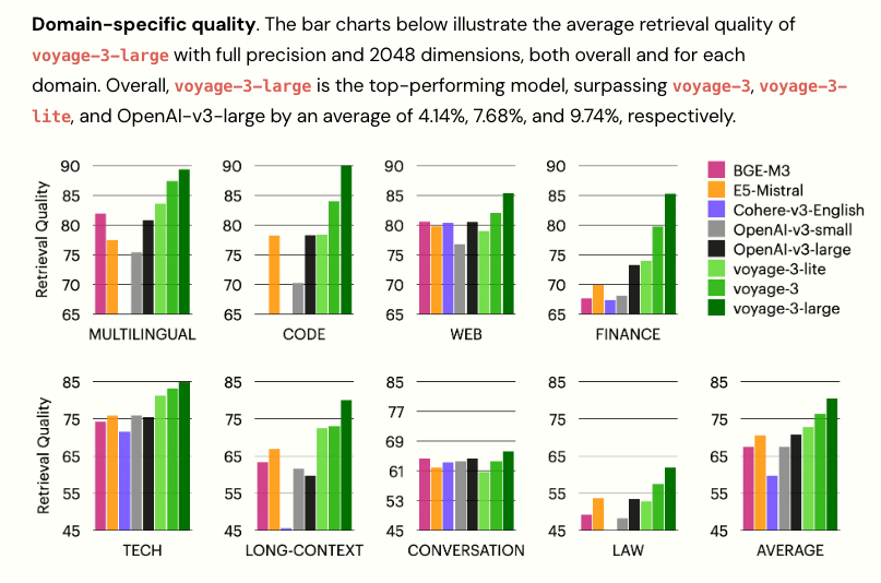 As language models have evolved, so have the vector embeddings generated by them. The evolution of embeddings has progressed from static models like Word2Vec and GloVe, which assign fixed vector representations to words, to dynamic models such as BERT and ELMo that generate context-aware embeddings. Early adopters leaned on encoder-only models like BERT to power everything from web search and recommendation engines to customer service chatbots. Then came large language models with broader world knowledge, stronger text understanding and reasoning, that further improved the quality of embeddings. Embedding models keep improving, like most cutting-edge AI. New releases promise better accuracy and richer context. Seen below are the new benchmarks set by the voyage-3-large model in Jan 2025.